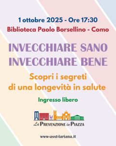 - L’edizione di quest’anno è stata anticipata da un incontro il 1 ottobre alle 17.30 nella Biblioteca Comunale di Como (ingresso libero) sul tema “Invecchiare sano, invecchiare bene”. Insieme al professor Andrea Maria Maresca, primario di Geriatria all’ospedale Sant’Anna, direttore del Dipartimento di Area Medica di Asst Lariana e direttore della Scuola di specializzazione in Geriatria all’Università degli Studi dell’Insubria, interverranno i geriatri di Asst Lariana. Si parlerà di salute cardiovascolare, salute di ossa e muscoli e di salute cognitiva.